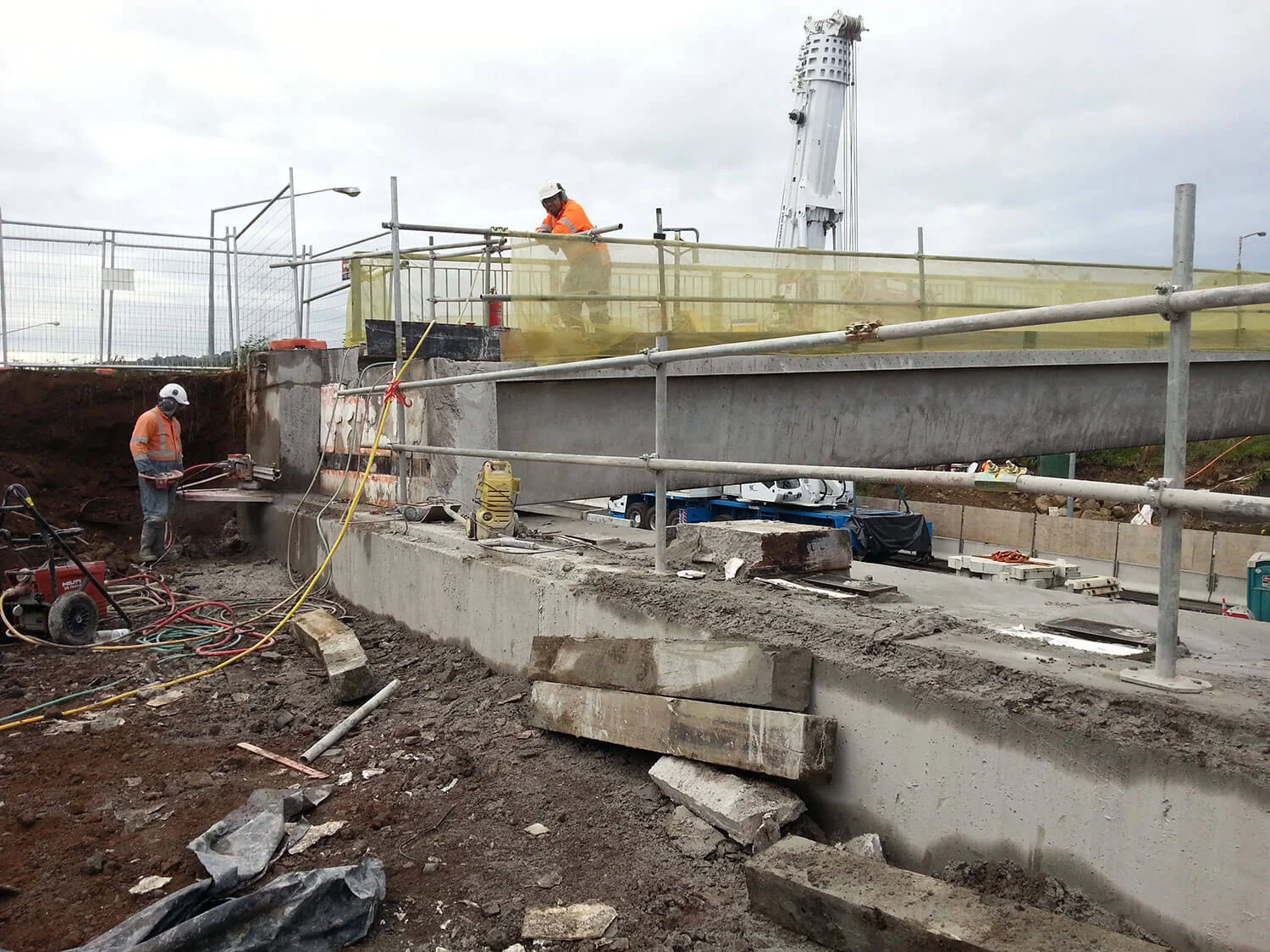 Cut the remaining bridge deck, including the asbestos sheeting permanent form work. This was done between 11.00pm and 4.00am during a motorway shutdown. A trough, 12 metres long, 375mm wide and 500mm deep was erected on top of an elevated working platform. This was positioned directly under the cut. This trough captured all the asbestos contaminated slurry. Air samples were taken adjacent to the cutting site to ensure that all asbestos was captured. As the work was being done at night, a 3-phase electric floor saw with noise reduced blade was used. From a distance of 20 metres, no cutting noise could be heard above the ambient noise levels.